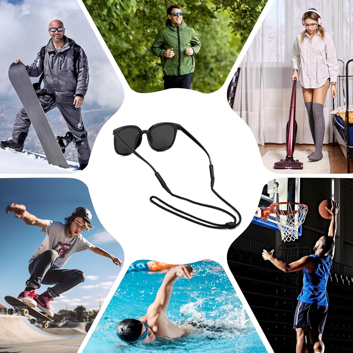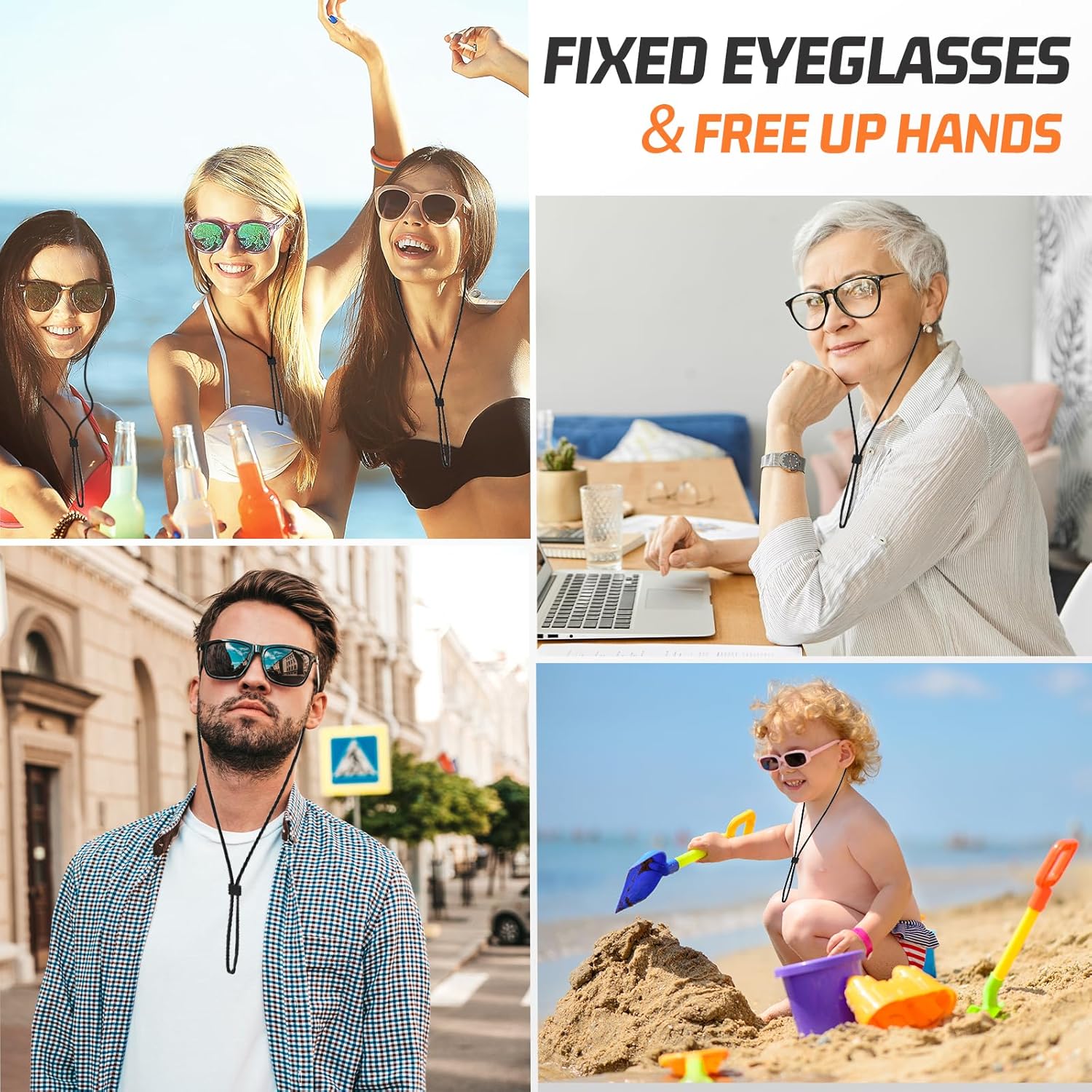【 PRACTICAL DESIGN 】The silicone interface at both ends has high elasticity and stretchability, which can fit most polarised sunglasses/presbyopes/safework goggles/anti-fog glasses/motorcycle riding glasses temples; with adjustable buckles to meet different wearing styles. Each sunglasses neck strap is 14.2inch long, fits most head circumference.