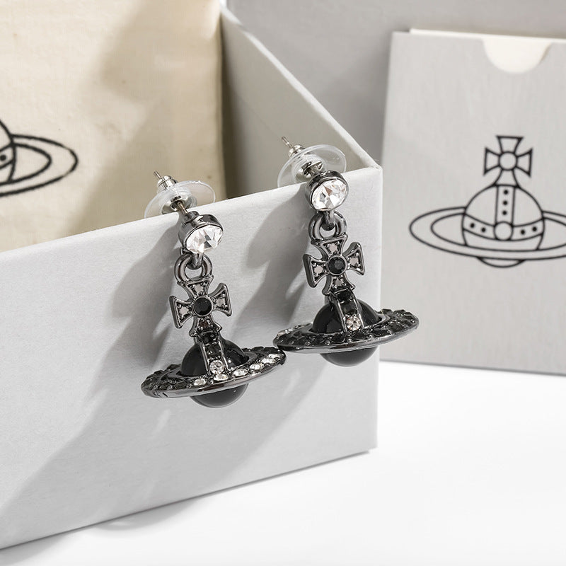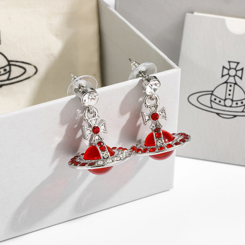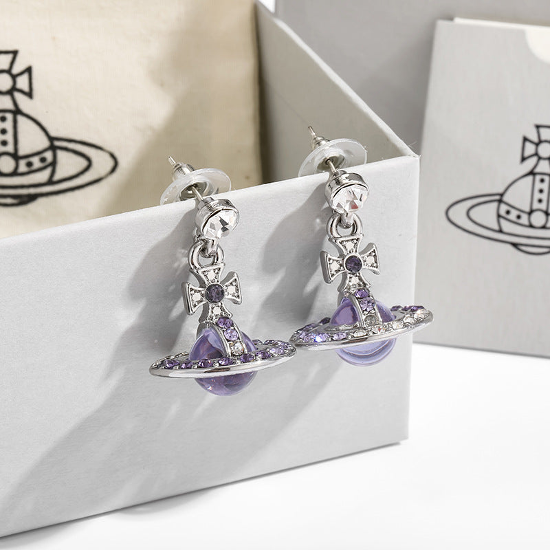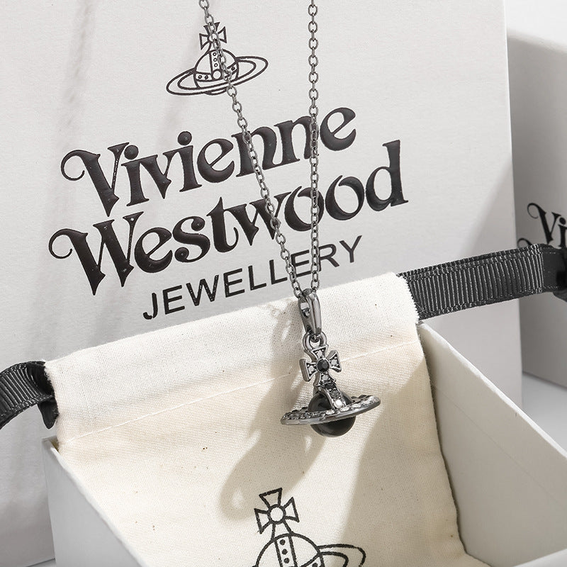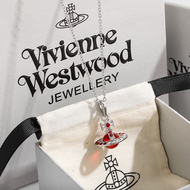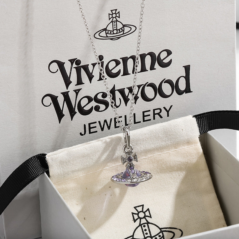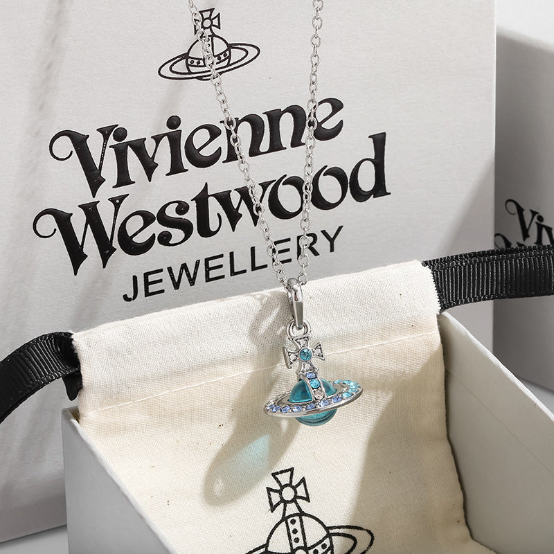 The Saturn Necklace features a stunning 3D Saturn design encrusted with shimmering blue crystals, making it a standout piece in any jewelry collection.