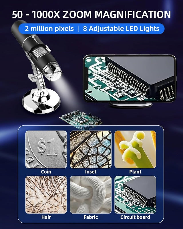 This digital microscope is an excellent tool for students, hobbyists, collectors, and repair professionals. Ideal for exploring coins, insects, plants, hair, textiles, and circuit boards, it makes learning and discovery exciting for both kids and adults.